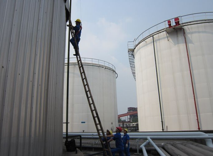 7月24日,受今年第8號(hào)熱帶風(fēng)暴“韋森特”的影響,西基油庫114、116號(hào)油罐保溫層部分金屬鋁皮被吹裂。為避免高空懸掛的金屬板掉落造成人員傷害,防止部分鉚口已開離的鋁皮再次遭到損壞,7月30日臺(tái)風(fēng)過后,油庫立即組織力量,對(duì)開裂的鋁皮進(jìn)行修復(fù),對(duì)部分鉚口已開離的鋁皮進(jìn)行加固。