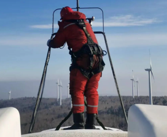 負責(zé)檢修的工作人員戴好安全帽、穿好安全衣、安全帶,佩戴好速差防墜器后,把防墜落安全鎖扣安裝在了爬梯上。在助爬器助力下,他們登上了75米高的風(fēng)機,整個攀爬過程異常艱險,爬梯被冰雪覆蓋,非常光滑,稍有不慎就有可能從高空中墜落。
